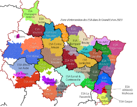 A. La région Grand Est, est à ce jour presque totalement couverte par les ESA avec quelques zones blanches.