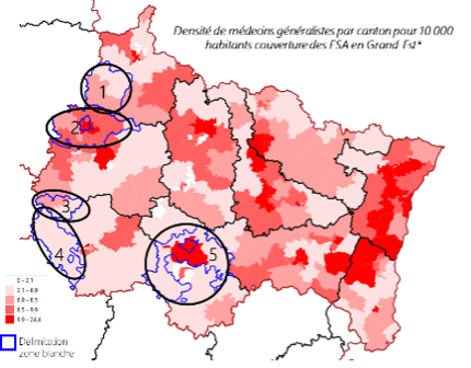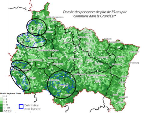 Cinq zones en région Grand Est ne sont pas couvertes par des ESA (Carte N°1). Ces zones blanches présentent par ailleurs une hétérogénéité de proportion des plus de 75 ans (Carte N°2) et une densité variable de médecins généralistes, ceux-ci étant les principaux prescripteurs de prise en charge par les (Carte N°3)