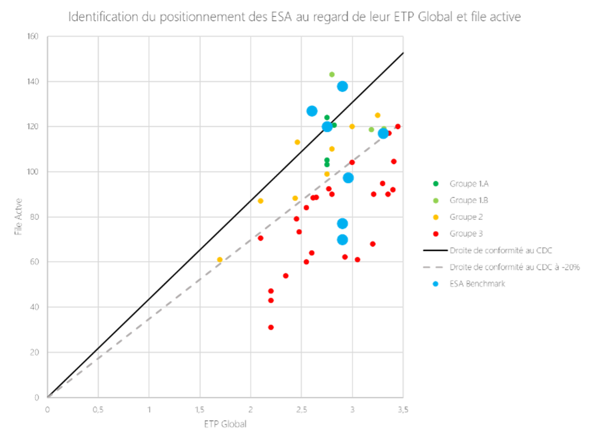 Groupe 1 Conforme au cahier des charges des ESA | Groupe 2 Eloigné du cahier des charges -20% (ETP et/ou file active) | Groupe 3 Le plus éloigné du cahier des charges (ETP/File active) |